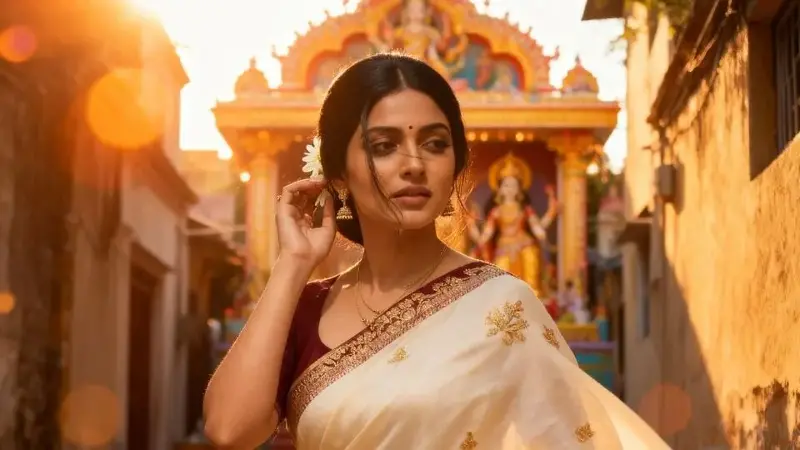 1) “Generate a cinematic portrait of a woman in a cream saree with rich maroon borders and delicate gold embroidery, standing in a softly lit alley leading to a Durga pandal at golden hour. Add warm amber flares and subtle lens dust for a natural film look.”