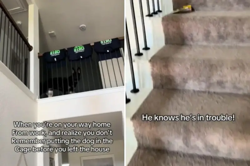 The clip included a text overlay that read: "When you're on your way home from work and realize you don't remember putting the dog in the cage before you left the house."