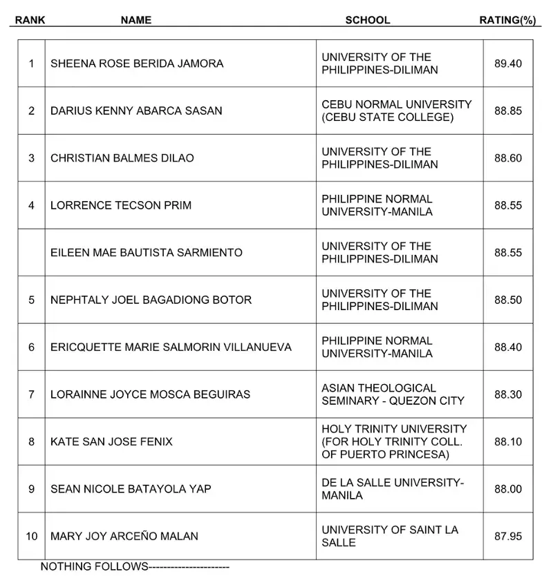 The successful examinees who garnered the ten (10) highest places in the August 2025 Guidance Counselors Licensure Examination are the following: